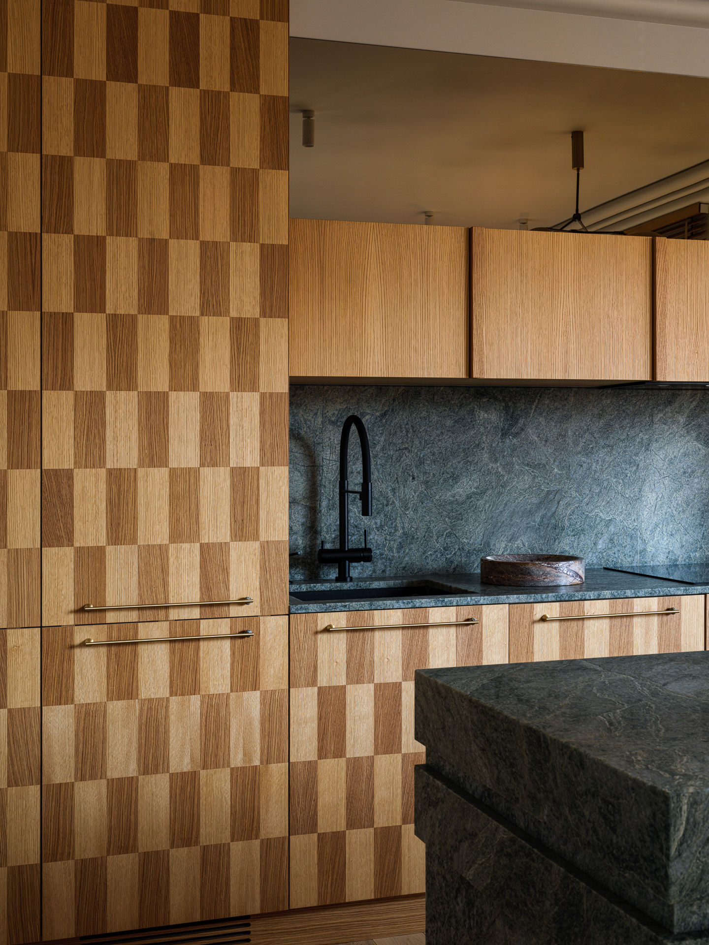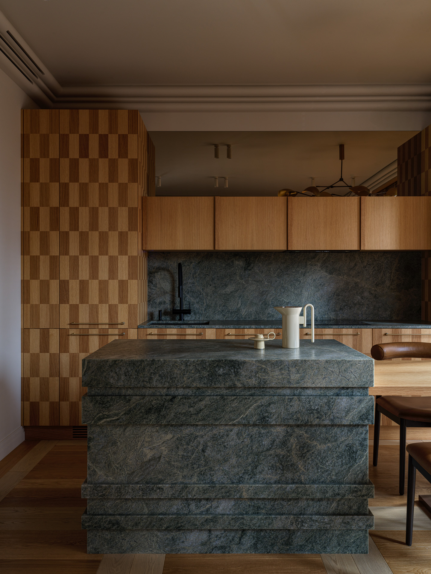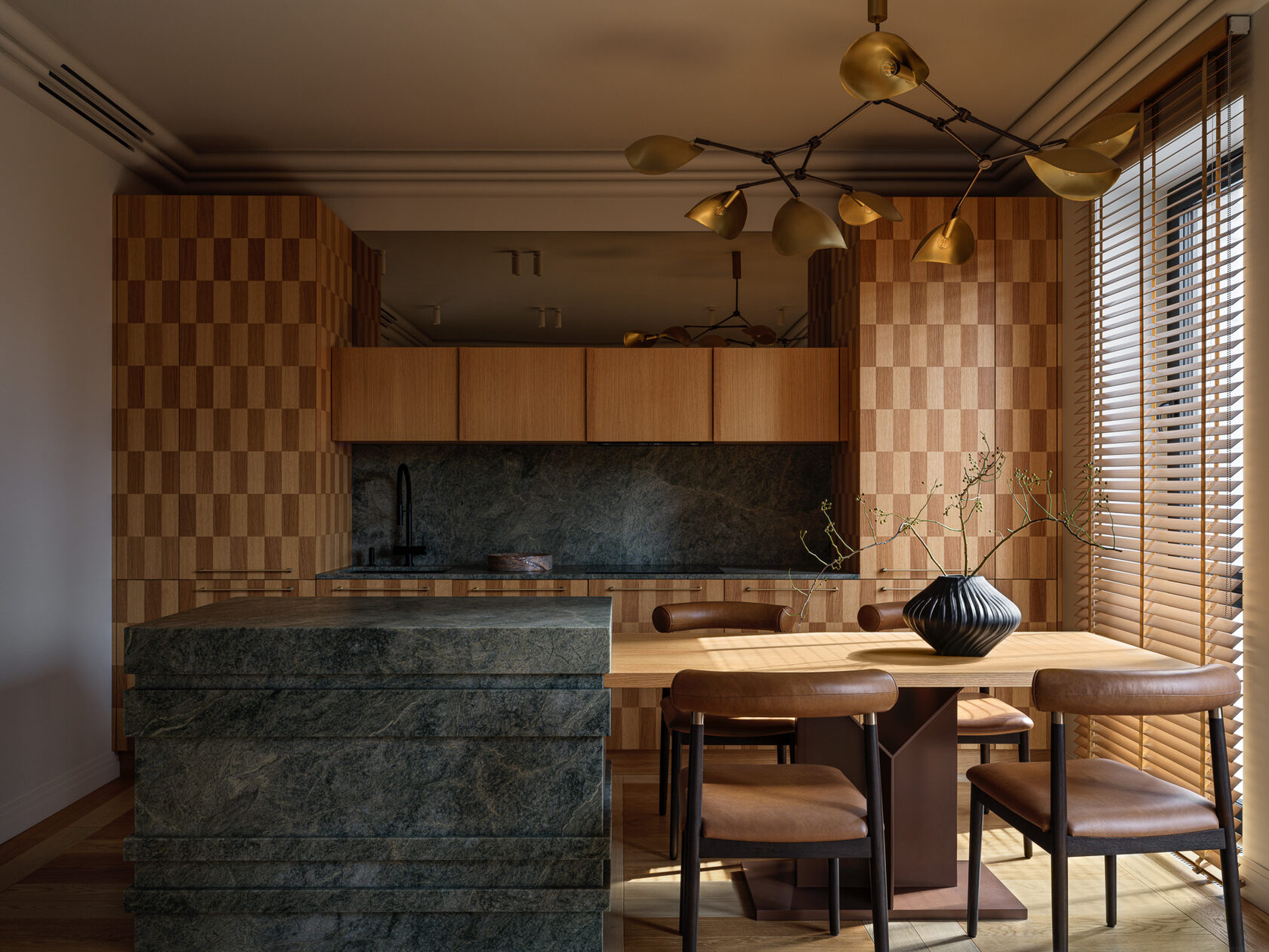 Пространство, согретое солнечными лучами, акцентирует внимание на природных элементах – дереве и камне. Екатерина Бурдина, как дизайнер, выбрала для кухонного гарнитура и рабочей зоны функциональный гранит изысканного зеленого оттенка. Кухонный остров оригинальный формы, созданный из этого же материала, является ключевым акцентом в помещении кухни-гостиной.