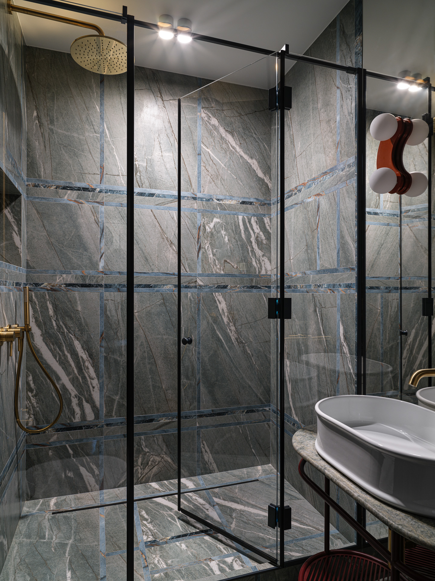 Для отделки гостевой ванной комнаты мы создали нестандартные элементы из керамогранита трех различных типов, учитывая индивидуальные размеры пола и стен.