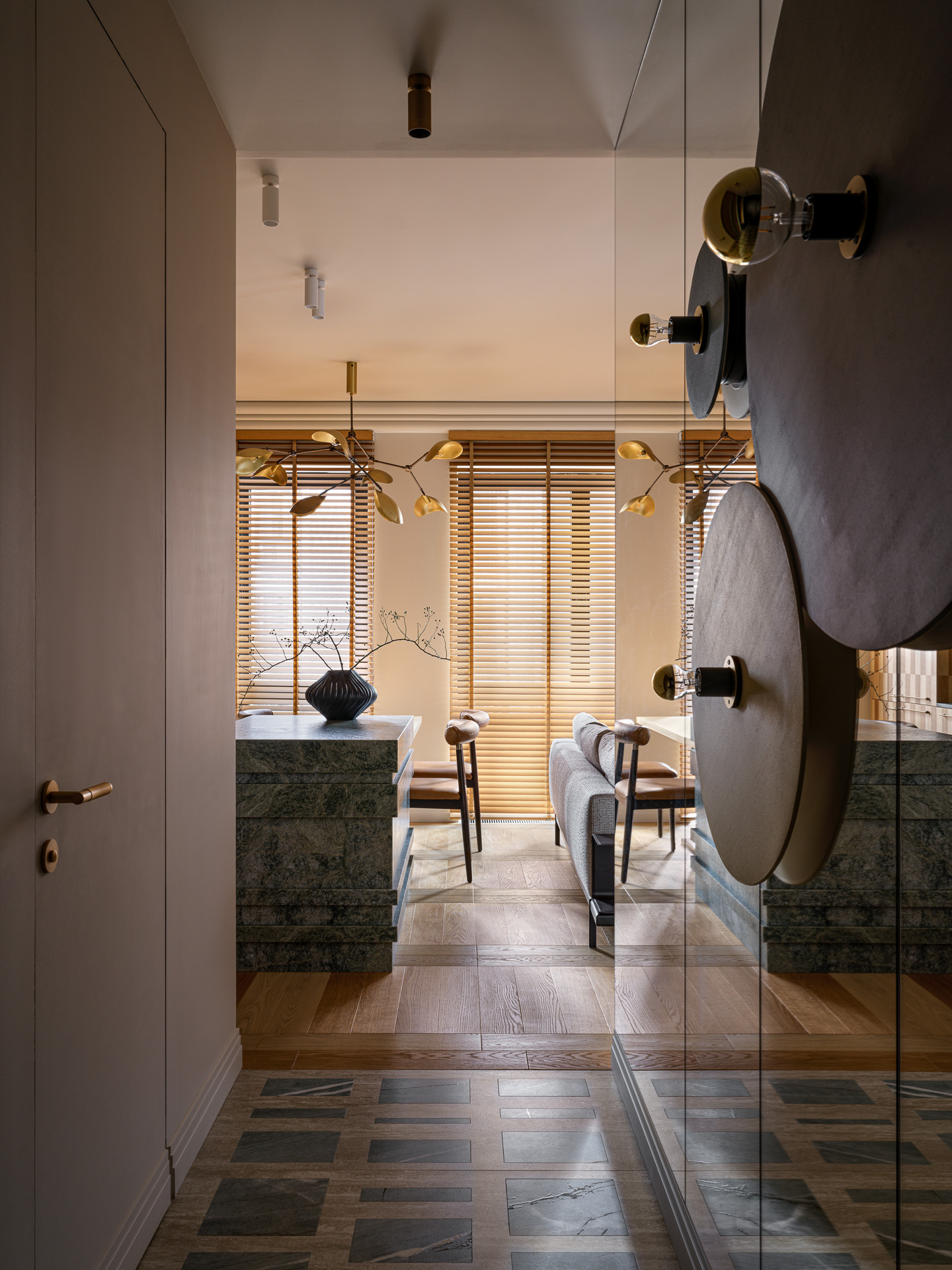 Изделия: столешница и фартук кухни, остров из гранита, полы и облицовка стен модулями из керамогранита